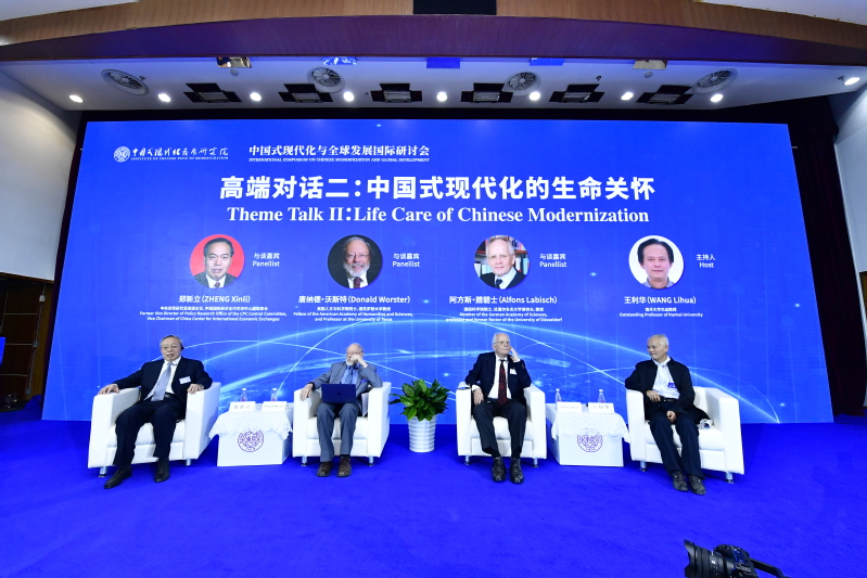 19日上午,我院王利华教授主持了主论坛高端对话环节,与唐纳德·沃斯特、阿方斯·腊碧士、郑新立三位教授围绕“中国式现代化的生命关怀”展开研讨,着重聚焦人民福祉及宏观经济政策等问题,分享中国切实可行的解决方案。