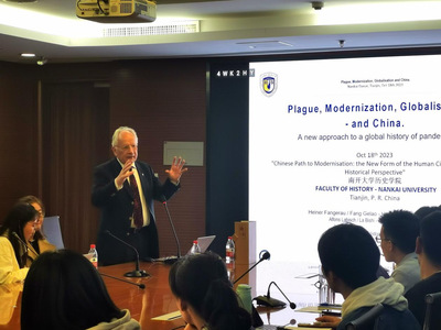10月18日下午,“南开史学百年大讲坛”第六讲在awcbet万象城天挺阁举办,特邀嘉宾是著名医学史专家,德国利奥波第那国家科学院院士、杜塞尔多夫大学原校长阿方斯·腊碧士(Alfons Labisch)教授。讲座由awcbet万象城院长余新忠教授主持。讲座开始前,余新忠院长对阿方斯·腊碧士教授做了简要介绍,并致送“南开史学百年大讲坛”主讲人聘书。