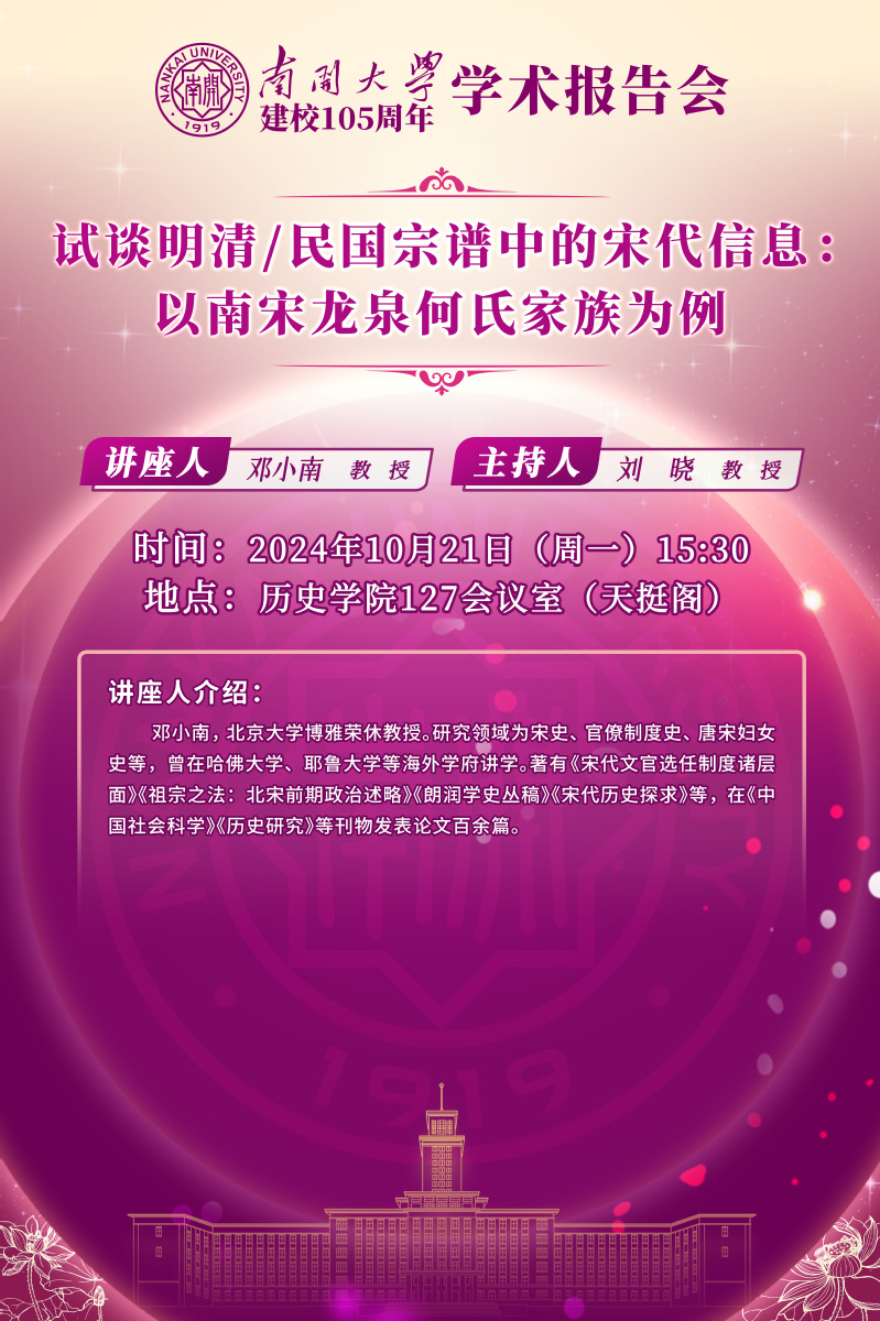讲座预告丨南开大学建校105周年学术报告会:试谈明清/民国宗谱中的宋代信息:以南宋龙泉何氏家族为例