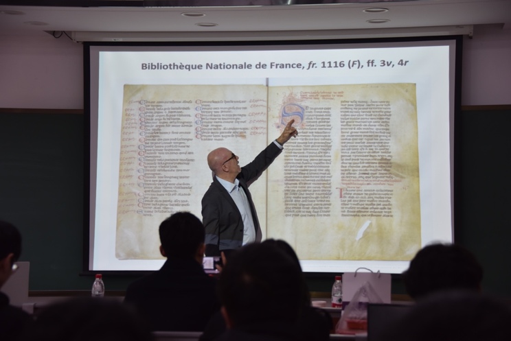 讲座第二部分介绍了马可·波罗之书诸抄本的情况。安德烈欧塞教授介绍了马可·波罗和鲁斯悌谦所处的时代背景,以及原初文本的“法意混合语”的语言特征。法国国家图书馆藏14世纪初的fr.1116抄本(F本)和2007年刊布的新发现f本残叶都保留了法意混合语,因此具有极其重要的价值。目前线索表明,马可·波罗之书可能并非一次性完成,马可·波罗本人可能对第一个版本的内容做了一些后续补充,这也使得马可·波罗之书的抄本谱系十分复杂。安德烈欧塞教授将已发现的140余种中世纪抄本大概划分为两大组(α、β)。依次讲解了α组的法语本(简称Fr)、加泰罗尼亚语K本、托斯卡纳语TA本、意大利北部方言VA本、由VA本翻译而来的修士皮皮诺的拉丁语P本等系统,以及β组的拉丁语Z本、威尼斯语V本等。安德烈欧塞教授向师生们展示了一些重要抄本的精美书影,并带领师生们释读图文内容,讲述其文本特征、抄本制作背景和传播过程,以及抄本的整理校勘现状等问题。