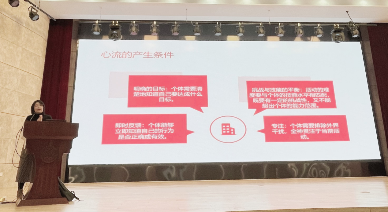 心流意指人们在全身心投入某事时达到的忘我境界。它能够使人产生幸福感和满足感,从而提升生活质量。要产生心流,就需要满足明确目标、及时反馈、挑战与技能的平衡以及高度专注四个条件。与此相应,王老师提出了实践心流理论的具体建议,即设定小目标,找到“心流活动”,创造心流环境,及时反馈与调整,保持好奇心和开放心态,以帮助同学们在不确定的生活中找到确定的力量。