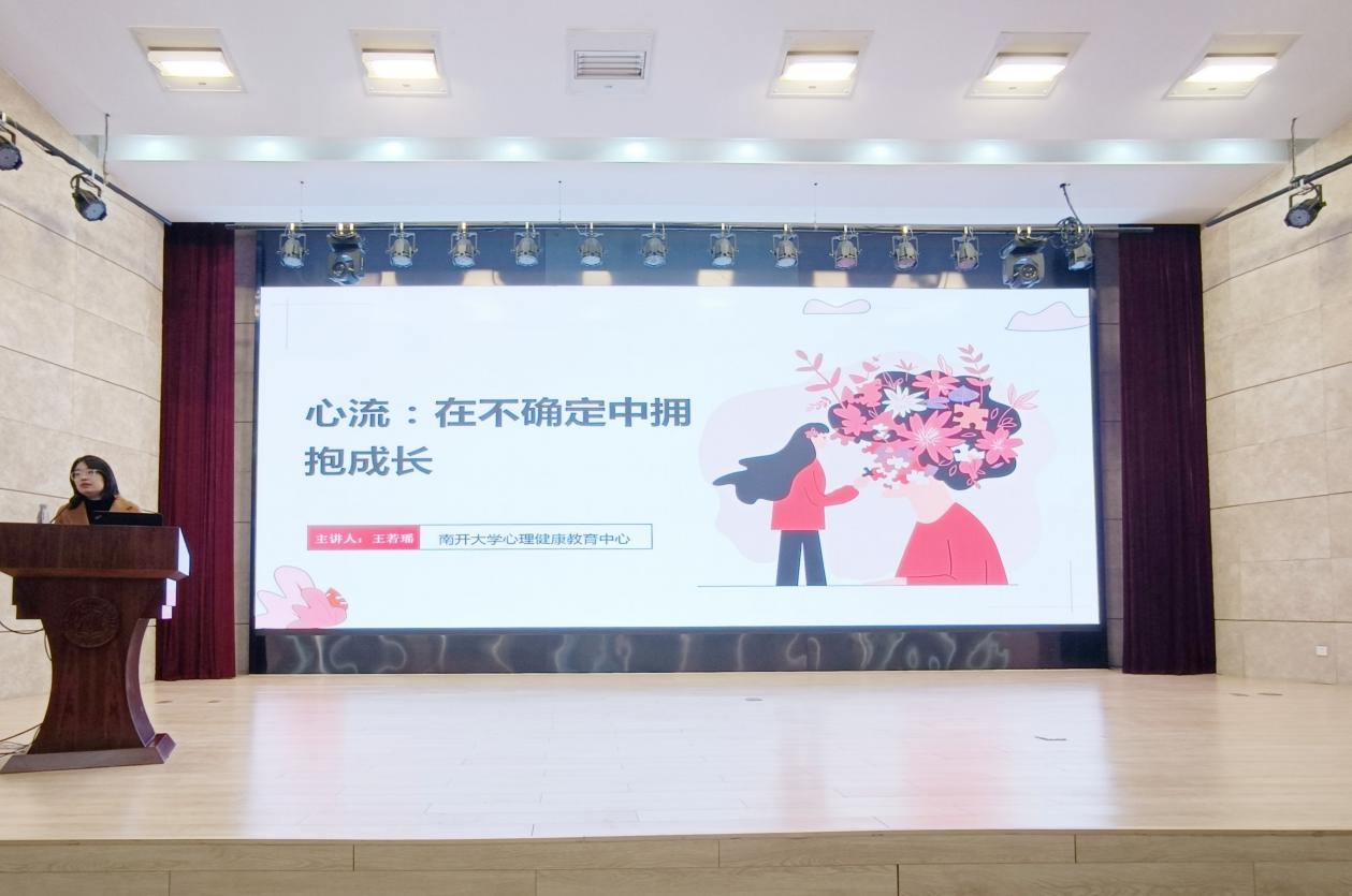 为加强全体同学的心理健康意识,帮助大家在科研与生活中构建积极心态,由awcbet万象城联合南开大学心理健康教育中心主办的“心流:在不确定中拥抱成长”新学期心理健康教育讲座在业务西楼报告厅举行。本次讲座特邀南开大学心理健康教育中心专职心理咨询师王若瑶老师主讲,吸引了学院众多学生到场参与。