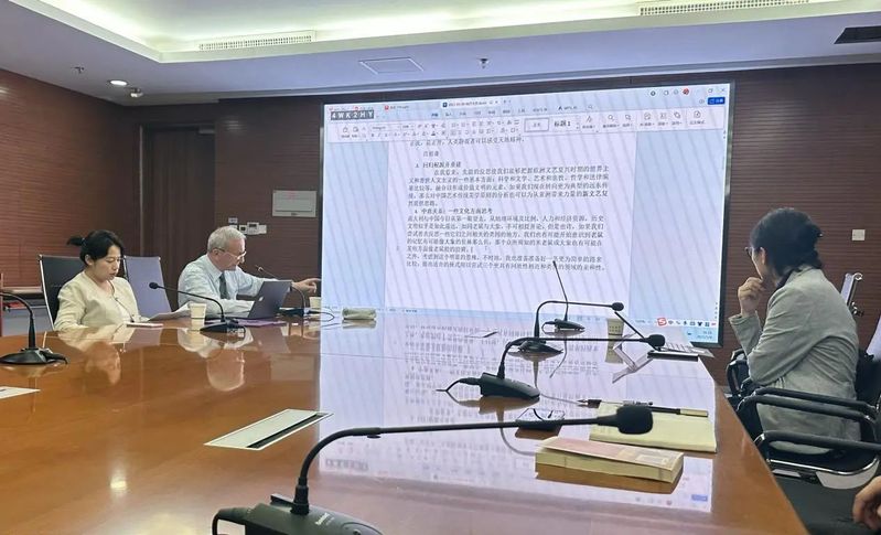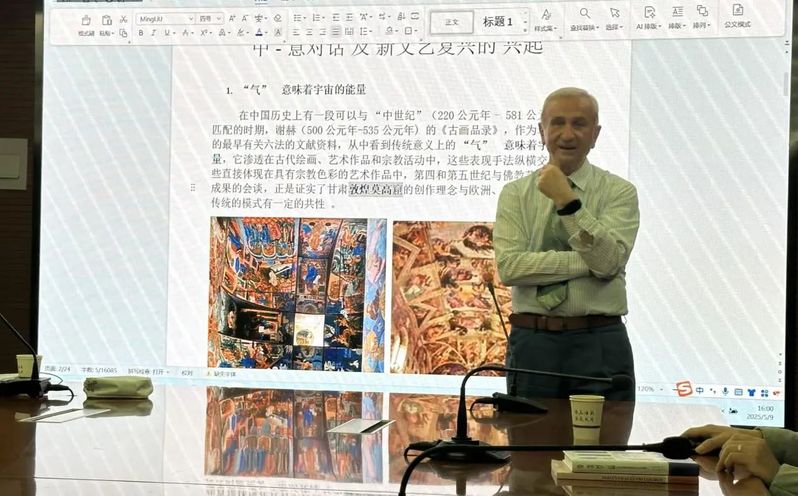 傅马利教授以敦煌壁画为切入点,指出敦煌莫高窟的创作理念与欧洲、中亚艺术和印度传统的模式有一定的共性,将传统意义上的宇宙能量渗透在古代绘画、艺术作品和宗教活动中。随后,他对比分析了中国北宋张择端绘《清明上河图》与意大利画家拉斐尔《雅典学院》的纸稿共同呈现出的文艺复兴思想特质。两幅画作均是长画幅的人物群像,《清明上河图》描绘了从事不同工作、身份各异的老百姓,并融入僧人、商人、骆驼等带有贸易往来的元素;《雅典学院》则汇聚当时各个地域、各个时代与各个领域的“天才”,展示文化合作的可能性。在此基础上,傅马利教授还引导在场的同学们发散思考在今天这一“未来”视角下《雅典学府》缺少的画面元素。